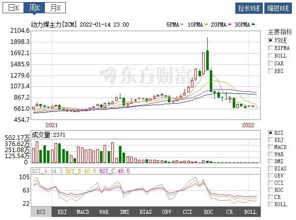 2022年1月14日,動(dòng)力煤主力合約2205開(kāi)盤于689元/噸,最高價(jià)695.6元/噸,最低價(jià)683.8元/噸,收盤于692.4元/噸,較上一交易日下跌8.6,跌幅1.23%,成交量6928手,持倉(cāng)量27976手,日減倉(cāng)356手。
