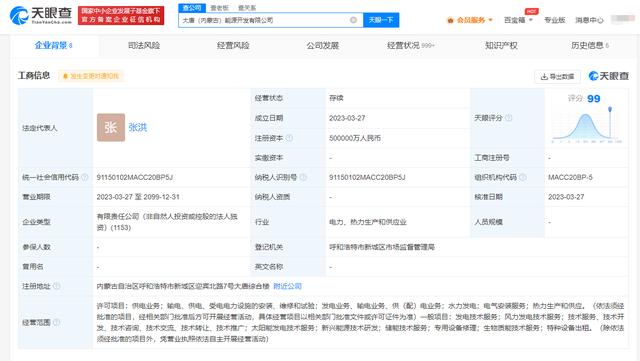 近日,大唐(內(nèi)蒙古)能源開(kāi)發(fā)有限公司成立,法定代表人為張洪,注冊(cè)資本50億人民幣,經(jīng)營(yíng)范圍包括供電業(yè)務(wù);輸電、供電、受電電力設(shè)施的安裝、維修和試驗(yàn);電氣安裝服務(wù);熱力生產(chǎn)和供應(yīng);太陽(yáng)能發(fā)電技術(shù)服務(wù);新興能源技術(shù)研發(fā)等。