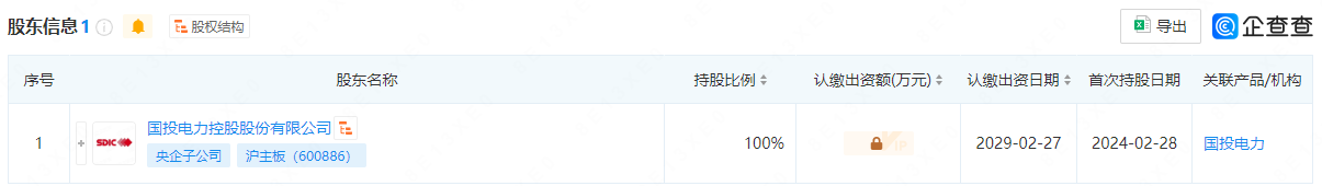 國際能源網(wǎng)通過企查查股權穿透圖顯示,國投(慶陽)新能源有限公司由國投電力全資持股。