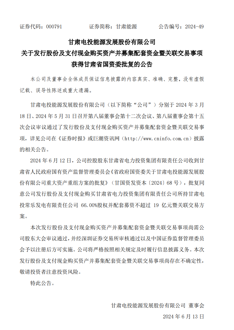甘肅能源發(fā)布公告稱,6月12日,公司控股股東甘肅省電力投資集團(tuán)有限責(zé)任公司收到甘肅省人民政府國(guó)有資產(chǎn)監(jiān)督管理委員會(huì)《省政府國(guó)資委關(guān)于甘肅電投能源發(fā)展股份有限公司重大資產(chǎn)重組方案的批復(fù)》(甘國(guó)資發(fā)資本〔2024〕68號(hào)),批復(fù)同意公司發(fā)行股份及支付現(xiàn)金購(gòu)買(mǎi)甘肅省電力投資集團(tuán)有限責(zé)任公司所持甘肅電投常樂(lè)發(fā)電有限責(zé)任公司66.00%股權(quán)并配套募資不超過(guò)19億元暨關(guān)聯(lián)交易方案。