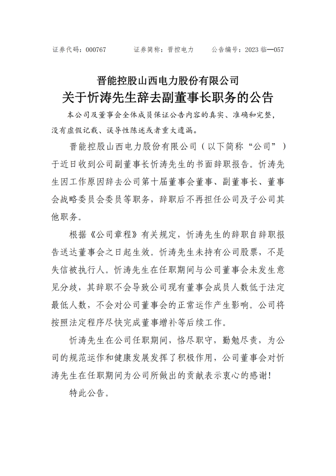晉控電力副董事長忻濤辭職。