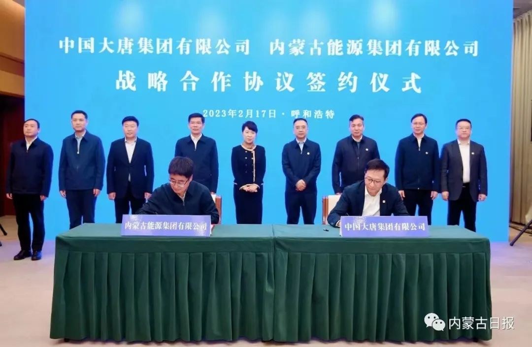 會(huì)見(jiàn)前,中國(guó)大唐集團(tuán)有限公司分別與內(nèi)蒙古自治區(qū)人民政府、內(nèi)蒙古能源集團(tuán)有限公司簽署戰(zhàn)略合作協(xié)議。王莉霞和鄒磊出席儀式并見(jiàn)證戰(zhàn)略合作協(xié)議簽約,共同為大唐內(nèi)蒙古能源開(kāi)發(fā)有限公司揭牌。