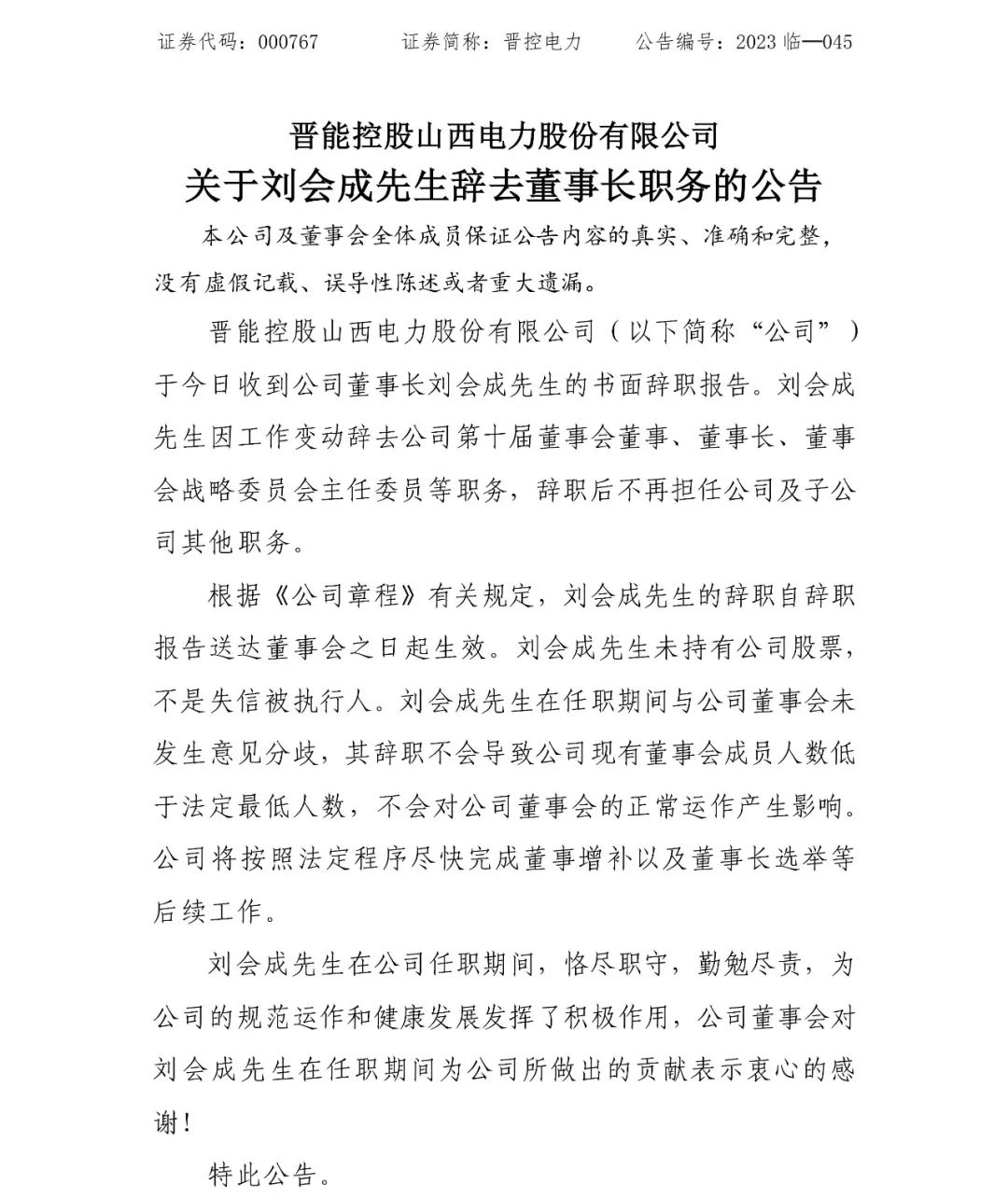 劉會(huì)成辭去晉控電力董事長職務(wù)。