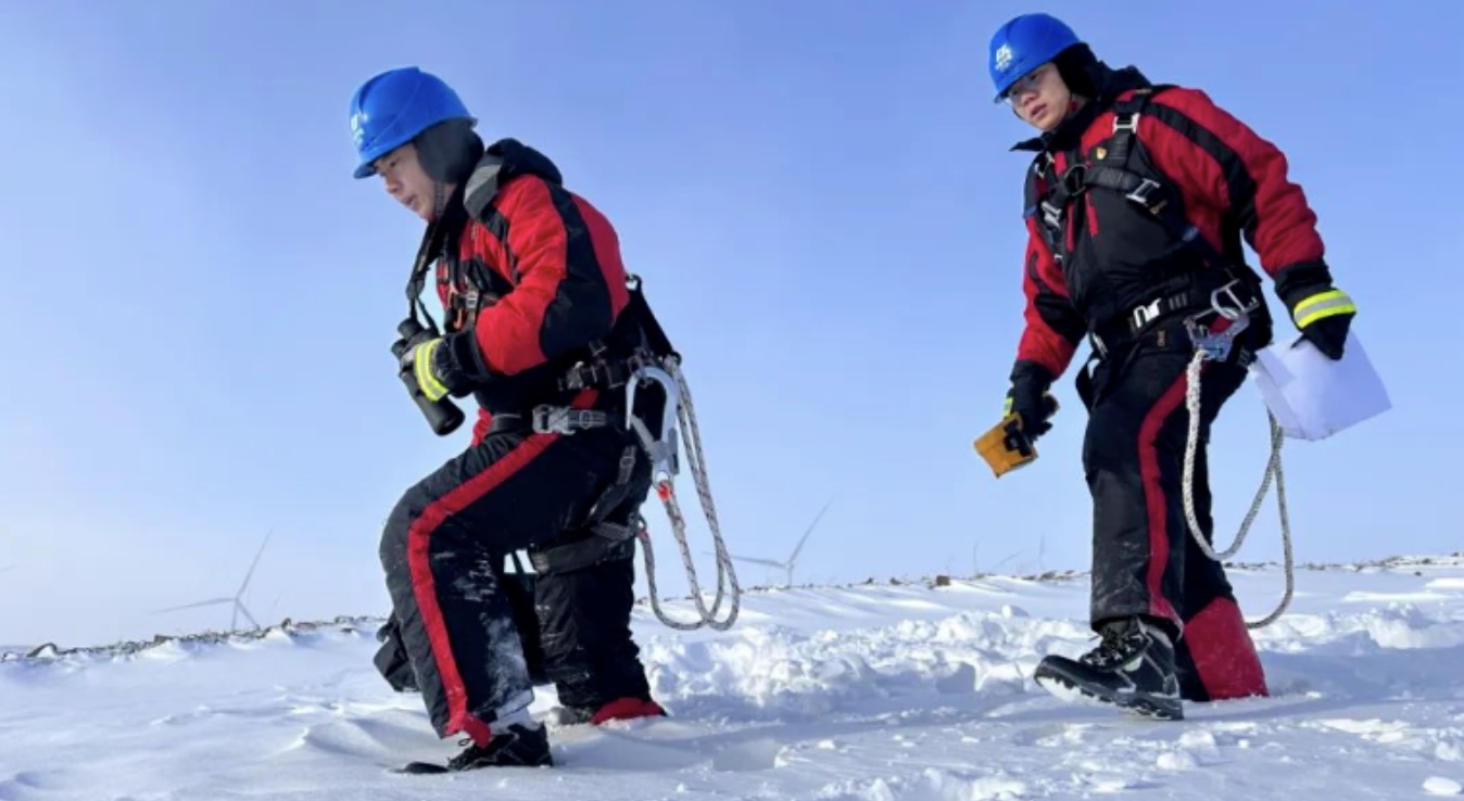 在最高氣溫只有零下26攝氏度河北張家口沽源縣,華電冀北新能源馳盛風(fēng)電場的運(yùn)維員工,冒著寒風(fēng)對輸配電線路進(jìn)行特巡,及時啟動極寒天氣應(yīng)急預(yù)案,通過“可視化+無人機(jī)+人工巡檢”的方式,開展線路及站內(nèi)設(shè)備特巡,加強(qiáng)設(shè)備監(jiān)控和消缺。