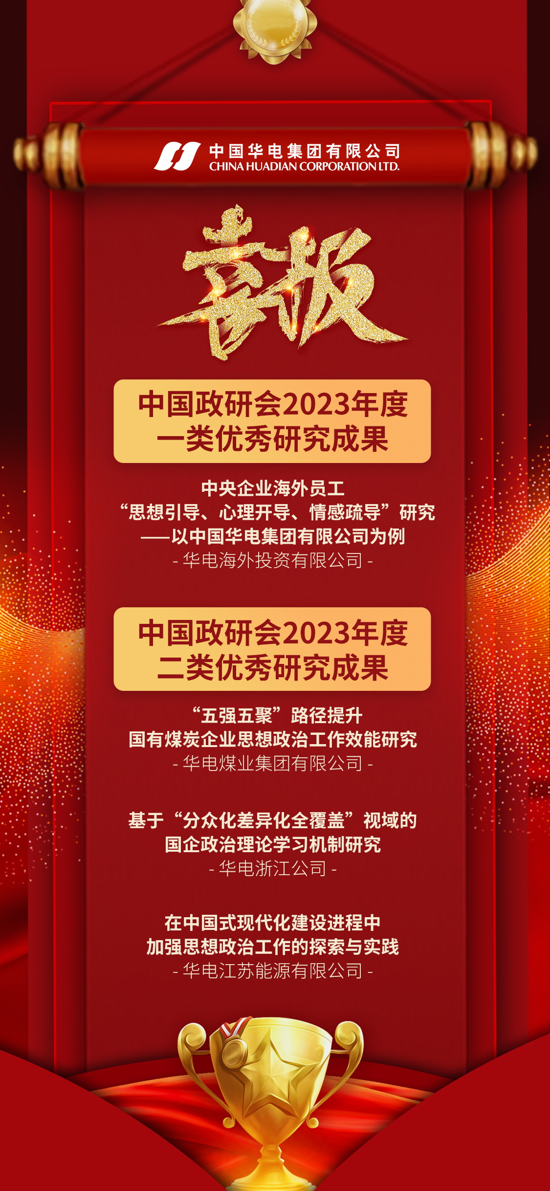 近日,經(jīng)中央宣傳部領(lǐng)導(dǎo)批準(zhǔn),中國思想政治工作研究會(huì)2023年度一、二、三類優(yōu)秀研究成果評(píng)選結(jié)果揭曉。集團(tuán)公司《中央企業(yè)海外員工“思想引導(dǎo)、心理開導(dǎo)、情感疏導(dǎo)”研究——以中國華電集團(tuán)有限公司為例》研究成果獲評(píng)一類優(yōu)秀研究成果,《“五強(qiáng)五聚”路徑提升國有煤炭企業(yè)思想政治工作效能研究》等3項(xiàng)研究成果獲評(píng)二類優(yōu)秀研究成果,所獲榮譽(yù)為全國思想政治工作研究領(lǐng)域最高獎(jiǎng)項(xiàng),等次和數(shù)量在全國政研會(huì)系統(tǒng)以及央企系統(tǒng)中名列前茅。這是繼獲得中央企業(yè)、中國電力政研會(huì)最高榮譽(yù)后,集團(tuán)公司思想政治工作研究成果再次取得突破、創(chuàng)出佳績。