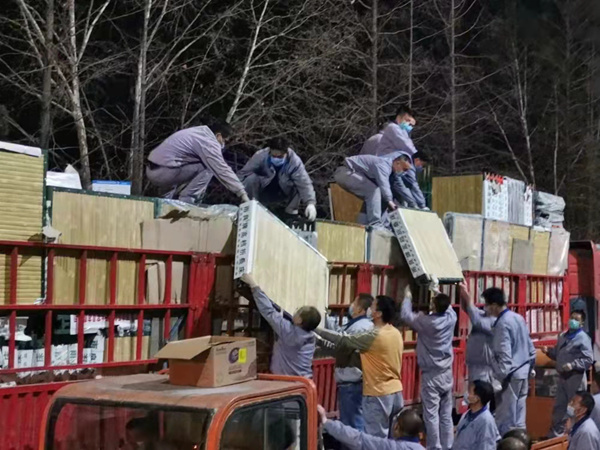 晚上21:40,行軍床運(yùn)到,中層干部、共產(chǎn)黨員、一線職工不分你我、爭先恐后爬上卡車搬運(yùn)。“大家戴上手套,注意安全,別傷著自己。”就在此時(shí),一直掛念著駐廠職工們的該公司黨委書記、總經(jīng)理任寶銅也來到了現(xiàn)場,親切的囑咐大家做好防護(hù)、小心搬運(yùn)。