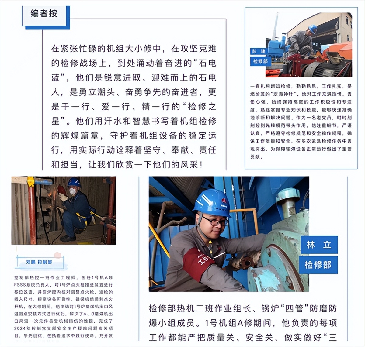 據(jù)了解,3至5月份,該公司相繼拉開了1號機A修、4號機A修和3號機C修的攻堅序幕,這是該公司實施一體化管理后迎來的首次機組年度檢修。面對建廠以來機組年度檢修項目最多、規(guī)模最大、工期最長的考驗,全體檢修參戰(zhàn)人員不畏艱難、迎難而上,始終堅守在檢修一線默默奉獻,涌現(xiàn)了一批沖鋒在前、奮勇攻堅的先進典型。