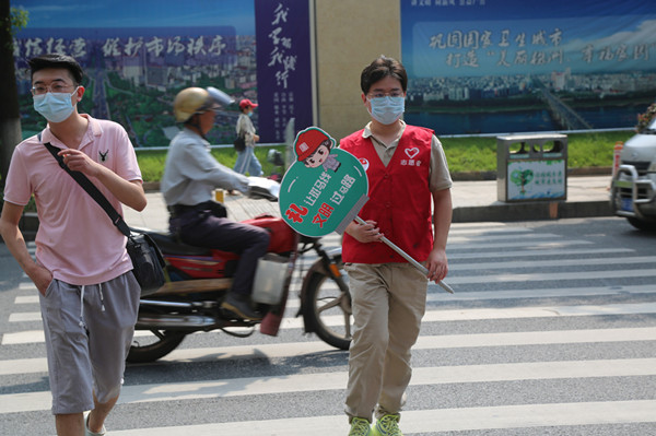 “不亂穿馬路,不翻越交通護欄。”“文明開車,不得車窗拋物。”“紅燈停、綠燈行,黃燈亮了等一等!”“禮讓斑馬線,文明過馬路。”志愿者們對過往行人不文明行為及時進行勸導(dǎo),為株洲文明城市建設(shè)貢獻力量。