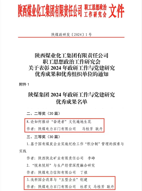 中國電力網(wǎng)訊 (通訊員:馬桂芳)10月30日,陜煤集團(tuán)思想政治工作研究會(huì)發(fā)布了《關(guān)于表彰2024年政研工作與黨建研究優(yōu)秀成果和優(yōu)秀組織單位的通知》,陜煤石門發(fā)電公司2項(xiàng)政研課題獲表彰。其中,《論如何推動(dòng)“奮進(jìn)者”文化遍地生花》獲評集團(tuán)公司優(yōu)秀成果二等獎(jiǎng),《淺析國企改革與“五型企業(yè)”創(chuàng)建》獲評集團(tuán)公司優(yōu)秀成果三等獎(jiǎng)。