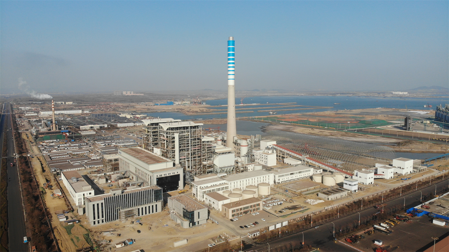 登上華能董家口熱電廠1號爐頂觀光平臺,映入眼簾的便是一望無際的碧海藍天,阡陌交通,機器相聞。俯瞰工業(yè)區(qū),整個項目不僅設(shè)計精巧,充滿工藝美,而且還是一座巨大的“充電寶”“暖寶寶”。