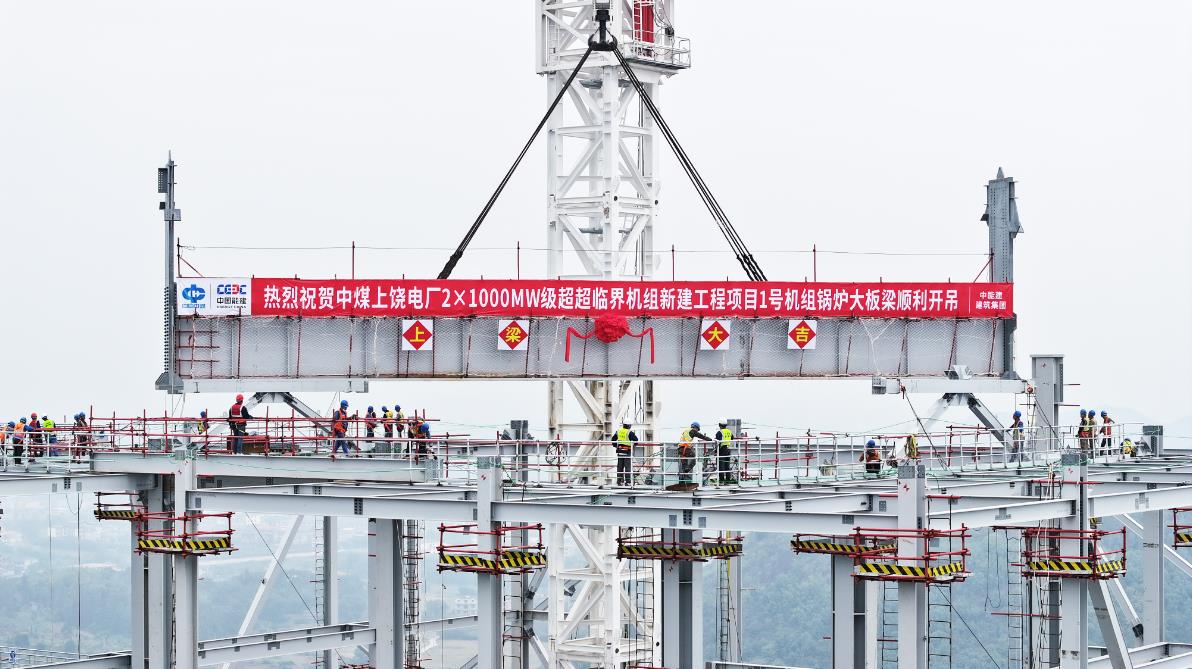 11月4日,中國能建建筑集團(tuán)承建的江西上饒發(fā)電廠2×1000兆瓦級超超臨界機(jī)組新建工程1號機(jī)組鍋爐大板梁開吊。