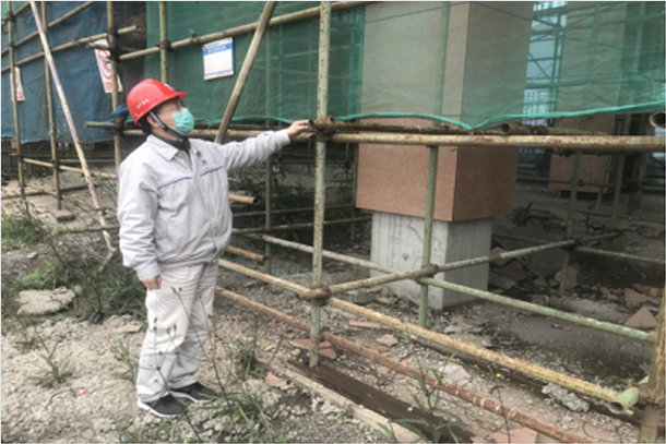 圖為安健環(huán)監(jiān)察部值班人員檢查現(xiàn)場(chǎng)腳手架