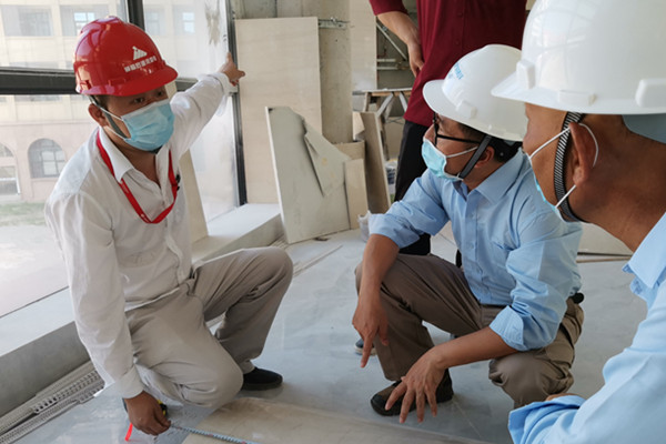 09:00,廠前區(qū)辦公樓正在加緊施工,新到貨石材亟待驗收。工程部值班人員會同施工監(jiān)理在廠前區(qū)連接體施工處檢查驗收新到貨石材。