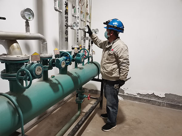 團(tuán)員青年檢查換熱站供熱管路壓力表