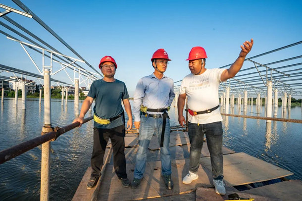 “從乘浮船‘踩點’開始,工作盡量提前,凡事親力親為,特別是三伏天后天氣超熱,我們避開最熱時段,早上4點就到現(xiàn)場,業(yè)主心疼我,我心疼工友,工友自然干勁足。打樁效率、質量直接關系到后續(xù)光伏面板安裝進度和全容量并網(wǎng)任務,不打好提前量,對不起業(yè)主方的信任厚愛……”,7月16日,茶從湖標段已打完4800余根樁基,完成80%以上的任務,光伏面板安裝進度超20%。8月15日再找他時,早已在江埠項目堯咀光伏區(qū)鏖戰(zhàn)了。