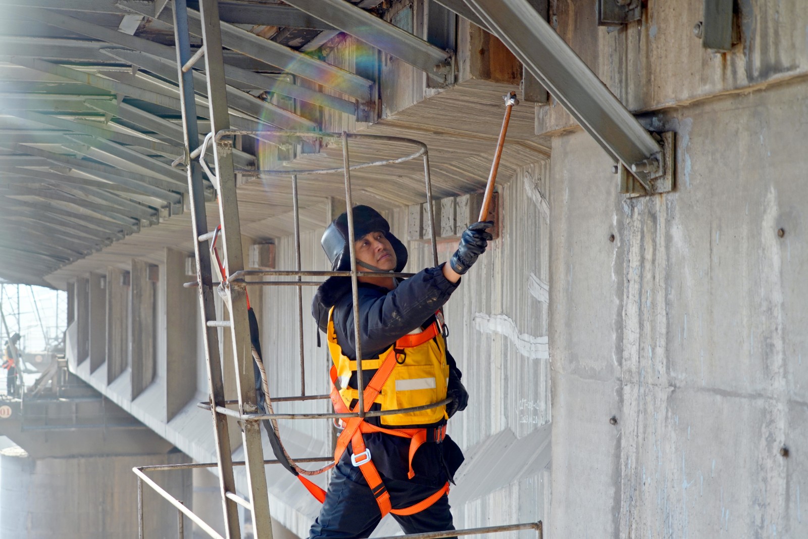 到達橋墩后的樊計林,掛好安全帶,如同變了一個人似的。在橋梁兩接頭處狹小的空間中閃轉(zhuǎn)騰挪,一會兒用檢查錘敲打螺栓,一會兒敲擊梁體,一會兒拿出卷尺測量,一會兒拿出扳手緊固螺栓……他們每個人從登上橋墩就開始忙忙碌碌,一刻不停。任憑寒風在耳旁嘶吼。