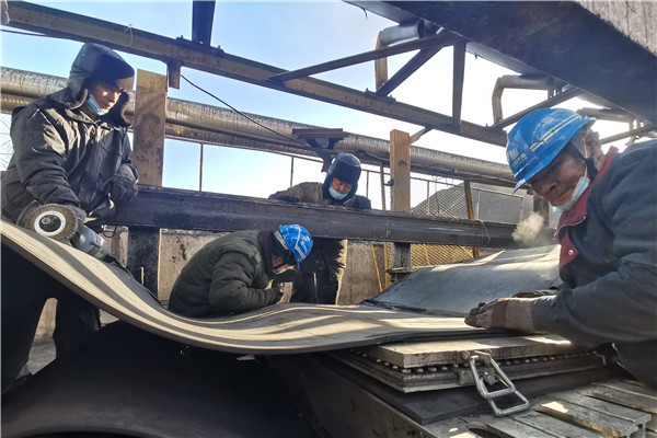 5日上午,工作人員做好粘接皮帶準(zhǔn)備工作,負(fù)責(zé)這次搶修工作的皮帶班,目前編制只有三名職工,承擔(dān)此次工作,顯然兩天內(nèi)完不成皮帶粘接任務(wù),燃運(yùn)分場打破常規(guī),合理分配人員,調(diào)派分場其他班組支援搶修,在剛剛完成三天搶修任務(wù)的情況下,克服困難繼續(xù)投入到搶修中。他們分工作業(yè)、分組負(fù)責(zé),一組用電火焊、導(dǎo)鏈、撬棍等工具修復(fù)皮帶滾筒,一組對斷裂皮帶進(jìn)行切割、打磨、對口、清洗、粘接和硫化等處理,同樣是在室外寒冷天氣搶修,汗水浸濕了他們的衣領(lǐng)和帽子,加上空間狹小,他們克服了重重困難,團(tuán)結(jié)作戰(zhàn),中午來不及休息,午飯后又繼續(xù)搶修工作,沒有一個人叫苦叫累,以頑強(qiáng)的毅力完成了當(dāng)天的皮帶粘接任務(wù)。