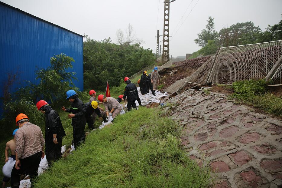 “鐵路專用線路場外區(qū)域索河鐵路大橋北段西側(cè)600米處護坡出現(xiàn)部分坍塌,我已撤到安全區(qū)域!”20日11時20分,巡線人員向指揮部報告。如果鐵路出了問題將無法運煤,沒有煤機組只能停運,指揮部的人員聽到這個消息都出了一身冷汗。2臺轉(zhuǎn)載機1臺運輸卡車立即到位,80余名黨員突擊隊員冒著大雨迅速來到塌方處,用石子、沙土等加固鐵路護坡,防止險情繼續(xù)擴大。