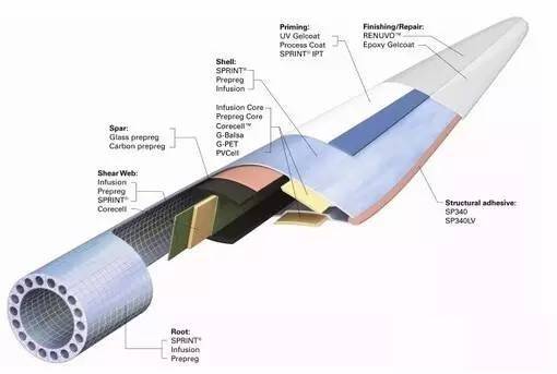 預浸料是生產(chǎn)復雜形狀結(jié)構件的理想工藝,預浸料在國外運用非常廣泛,其工藝及設備也發(fā)展到成熟階段。實際生產(chǎn)中,由于葉片的蒙皮、主梁、根部等各個部位的力學性能及工藝的要求各不相同,因而,在不影響性能的條件下,為了降低成本,不同部分使用不同的預浸料。