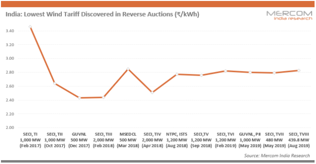 根據(jù)Mercom India Research的數(shù)據(jù),由于招標不足,2019財年已招標了超過5吉瓦的風能項目,其中2019年迄今為止已拍賣了3吉瓦的風能項目。2019年,平均風電稅率為每千瓦時2.80盧比(約合0.039美元)。 Mercom去年報告稱,自電子逆向拍賣啟動以來,截至2018年12月,已拍賣了約9.5吉瓦的風能項目。