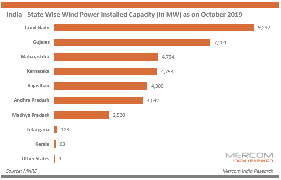 政府設定了到2022年安裝60 GW風力發(fā)電能力的目標。根據(jù)MNRE,印度的累計風力發(fā)電安裝量已突破37 GW大關,到2019年10月為37,090.03 MW。