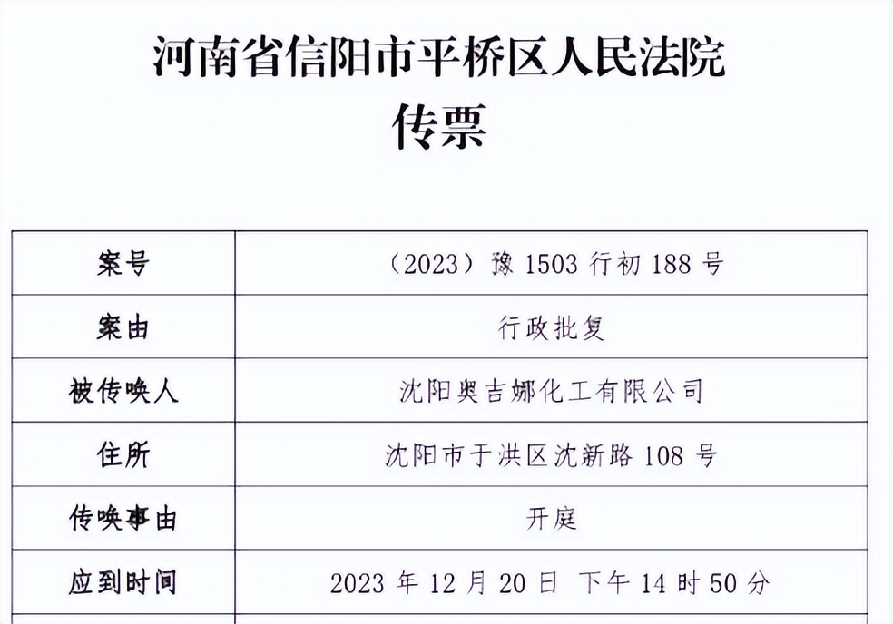 2023年12月1日,中國風電潤滑油龍頭企業(yè)沈陽奧吉娜化工有限公司(下簡稱奧吉娜公司)收到河南省信陽市平橋區(qū)人民法院開庭傳票,奧吉娜公司訴信陽市生態(tài)環(huán)境局和第三人華陽長青投資有限公司行政訴訟案,將于2023年12月20日14時50分開庭審理。屆時,這起風電潤滑油央企招投標“民告官”第一案結(jié)果如何,讓我們拭目以待。
