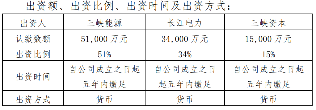 公告披露,為切實(shí)提高三峽能源天津區(qū)域市場(chǎng)競(jìng)爭(zhēng)力,加大天津區(qū)域業(yè)務(wù)統(tǒng)籌力度,公司擬與中國(guó)長(zhǎng)江電力股份有限公司(以下簡(jiǎn)稱(chēng)長(zhǎng)江電力)、三峽資本控股有限責(zé)任公司(以下簡(jiǎn)稱(chēng)三峽資本)在天津設(shè)立合資公司三峽集團(tuán)天津能源投資有限公司(最終以企業(yè)登記注冊(cè)的名稱(chēng)為準(zhǔn)),全方位布局在津業(yè)務(wù),重點(diǎn)聚焦環(huán)渤海海上風(fēng)電基地開(kāi)發(fā),推進(jìn)新能源項(xiàng)目開(kāi)發(fā)建設(shè)。三峽能源、長(zhǎng)江電力與三峽資本以貨幣出資分別認(rèn)繳5.1億元、3.4億元、1.5億元,占合資公司注冊(cè)資本的比例分別為 51%、34%、15%。