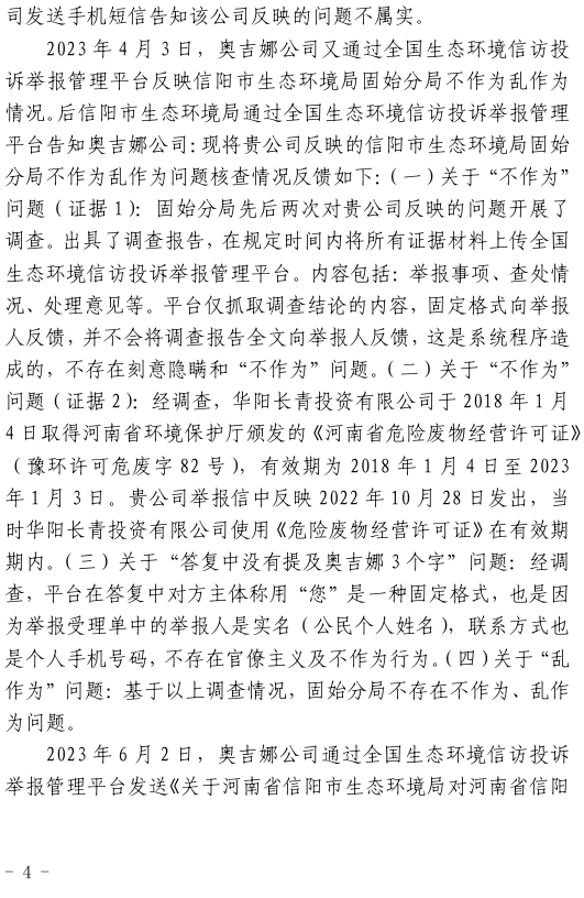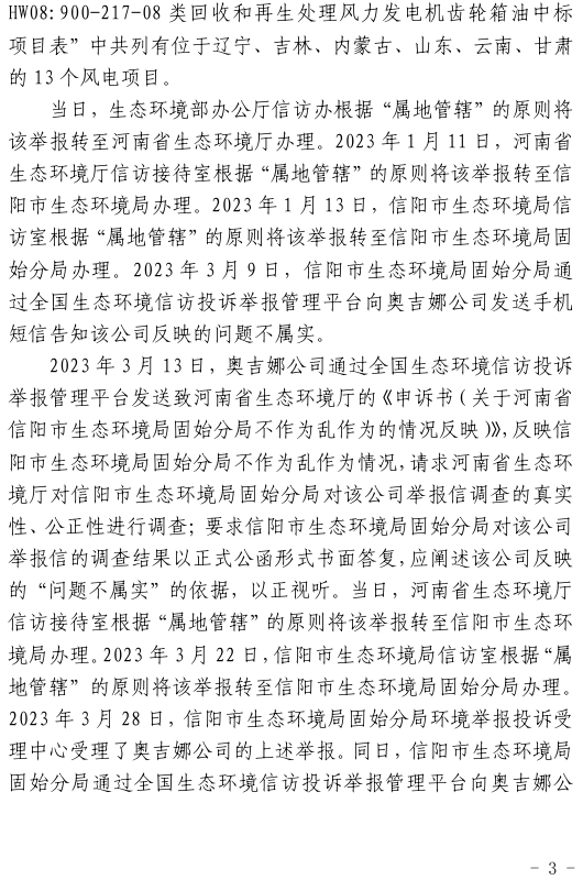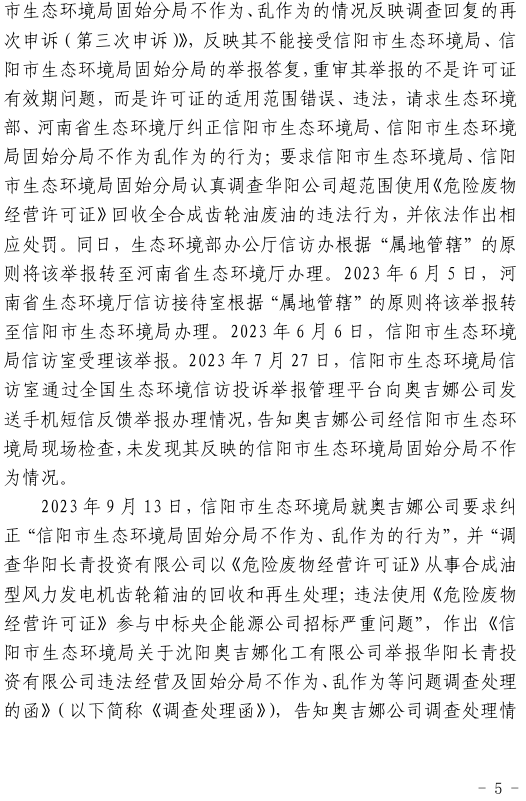 2023年3月9日,奧吉娜公司收到固始分局通過12369環(huán)境信訪平臺的短信答復:“反映問題不屬實”。3月10日,奧吉娜公司向固始分局負責人電話詢問,其解釋稱:經調查核實,華陽長青公司沒有再生風電潤滑油銷售,出售的是新油。否定了奧吉娜公司的舉報內容。對此,奧吉娜公司表示強烈不滿。3月11日,奧吉娜公司向環(huán)境部投訴固始分局的不作為和亂作為。2023年5月26日,奧吉娜公司收到12369環(huán)境信訪平臺的短信答復。答復部門為信陽環(huán)境局。令人啼笑皆非的是,答復稱,華陽長青的許可證有效期沒有問題,與舉報內容風馬牛不相及。2023年6月13日,奧吉娜公司再次向環(huán)境部提出申訴,指出,奧吉娜舉報的不是許可證有效期問題,而是許可證的適用范圍錯誤、違法。2023年7月27日,奧吉娜公司收到回復稱,經信陽市生態(tài)環(huán)境局現(xiàn)場檢查,未發(fā)現(xiàn)固始分局不作為情況。2023年8月3日,奧吉娜公司向河南省生態(tài)環(huán)境廳(以下稱:環(huán)境廳)舉報信陽環(huán)境局包庇固始分局的行為。環(huán)境廳對此高度重視,有關處長和奧吉娜公司負責人進行了面談。2023年9月13日,信陽環(huán)境局向奧吉娜公司致《信陽市生態(tài)環(huán)境局關于沈陽奧吉娜化工有限公司舉報華陽長青投資有限公司違法經營及固始分局不作為、亂作為等問題調查處理的函》。函中:一是,以“齒輪箱”替換“齒輪箱油”,偷換概念;二是,做出了廢風電合成(齒輪)油不屬于危險廢物的結論;三是,未發(fā)現(xiàn)固始分局存在不作為、亂作為的不當行為。再次否定奧吉娜公司的舉報和投訴。