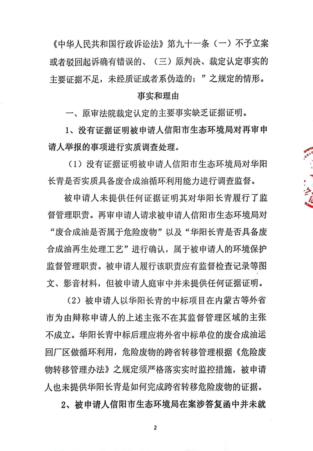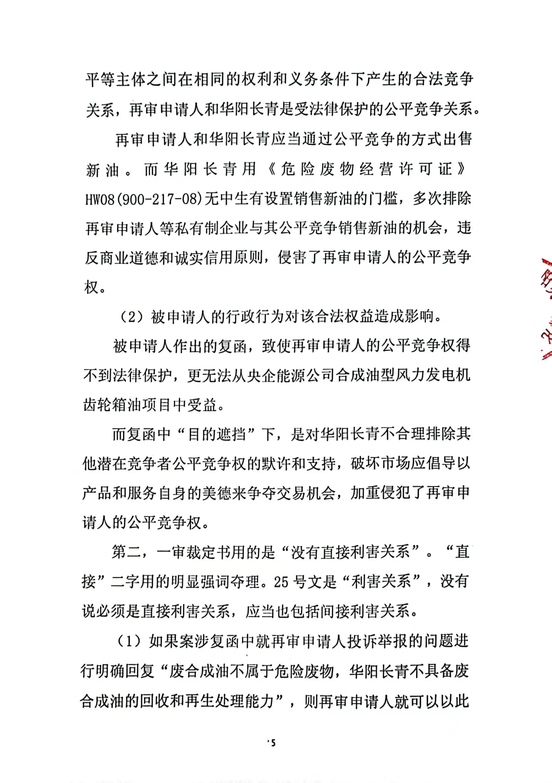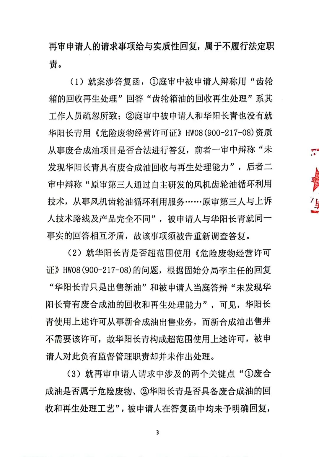 奧吉娜公司在再審申請中再次要求對兩個關鍵問題進行法庭調查:1、《調查處理函》中的回答是錯誤的。信陽市生態(tài)環(huán)境局依據(jù)《國家危險廢物名錄(2021版)》認定廢合成油不屬于危險廢物,不需要《危險廢物許可證》這種回答是錯誤的,而且作為一個市級行政職能部門信陽市生態(tài)環(huán)境局也無權作出這種認定。2、根據(jù)奧吉娜公司對目前廢合成型風電潤滑油再生技術的了解,華陽長青公司不具備廢合成型風電潤滑油的再生能力,所謂的再生處理存在造假和欺騙的嫌疑!