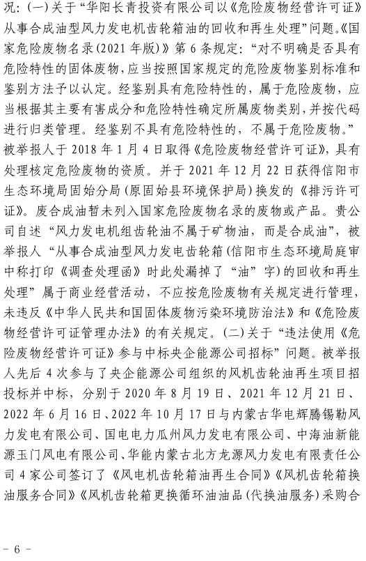 奧吉娜公司在參與各央企風電潤滑油招投標采購中發(fā)現(xiàn),注冊于河南省信陽市固始縣的華陽長青投資有限公司(以下稱:華陽長青公司),憑借其持有的《危險廢物經營許可證》,屢次以“風電齒輪油再生利用”的名義中標。然而,奧吉娜公司發(fā)現(xiàn),華陽長青公司的《危險廢物經營許可證》適用范圍并不包含合成型廢風電齒輪油,屬于違規(guī)使用,涉嫌違反《環(huán)境保護法》。于是,2022年10月18日,奧吉娜公司依法向國家生態(tài)環(huán)境部(以下稱:環(huán)境部)進行舉報。按程序,舉報調查由信陽市生態(tài)環(huán)境局固始分局(以下稱:固始分局)辦理。