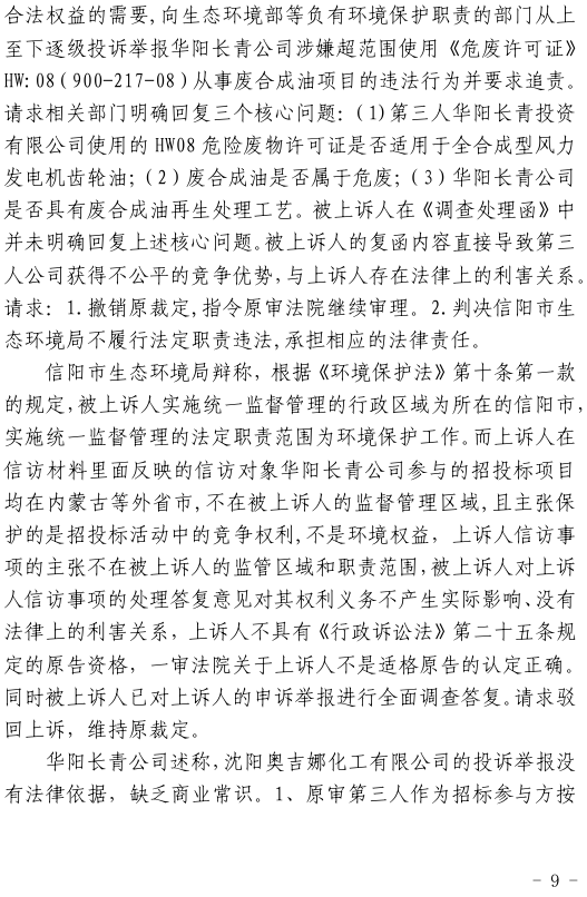 2、一審訴訟請求:請求人民法院判決撤銷被告作出的《信陽市生態(tài)環(huán)境局關于沈陽奧吉娜化工有限公司舉報華陽長青投資有限公司違法經營及固始分局不作為、亂作為等問題調查處理的函》;責令被告對原告向被告舉報華陽長青投資有限公司事項,限期進行重新調查和答復;判令被告認定的廢合成油不應按危險廢物有關規(guī)定進行管理違反法律規(guī)章規(guī)定,無效。