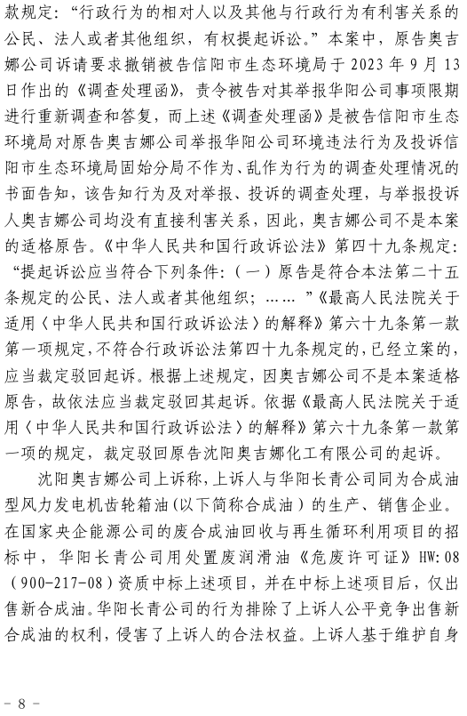 2023年10月18日,奧吉娜公司依據(jù)《行政訴訟法》和《行政訴訟法解釋》,將信陽市環(huán)境局和第三人華陽長青公司訴至信陽市平橋區(qū)人民法院,請求法院:1、判決撤銷被告作出的《信陽市生態(tài)環(huán)境局關于沈陽奧吉娜化工有限公司舉報華陽長青投資有限公司違法經營及固始分局不作為、亂作為等問題調查處理的函》;2、責令被告針對原告于2023年8月3日向被告申訴舉報華陽長青投資有限公司事項,限期進行重新調查和答復;3、請求人民法院判令被告2023年9月13日調查處理函認定的廢合成油不應按危險廢物有關規(guī)定進行管理,違反法律規(guī)章的規(guī)定,無效。