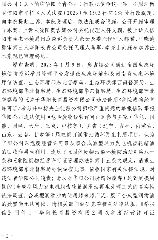 中國電力網訊 中國風電潤滑油龍頭企業(yè)沈陽奧吉娜化工有限公司(下簡稱:奧吉娜公司或上訴人)訴信陽市生態(tài)環(huán)境局(被上訴人)和第三人華陽長青投資有限公司(下簡稱:華陽長青公司)行政訴訟案,河南省信陽市中級人民法院于2024年4月2日作出二審行政裁定:駁回上訴,維護原裁定。