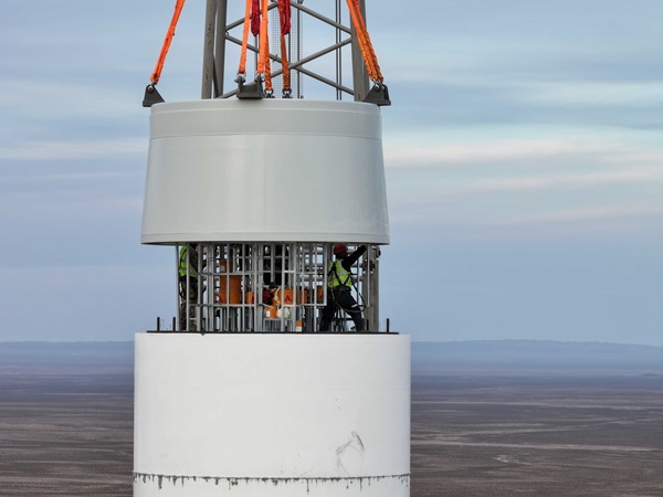 該首臺(tái)套風(fēng)電機(jī)組并網(wǎng),標(biāo)志著全球規(guī)?;逃米畲蠡焖L(fēng)力發(fā)電機(jī)組在內(nèi)蒙古能源集團(tuán)成功發(fā)電運(yùn)行。項(xiàng)目使用的風(fēng)電設(shè)備單機(jī)容量10兆瓦,混塔高134.4米,整機(jī)高度140米,葉片長(zhǎng)112米,風(fēng)輪直徑230米,覆蓋及掃風(fēng)面積更大,經(jīng)濟(jì)性和發(fā)電量相對(duì)更高。值得一提的是,此項(xiàng)目風(fēng)機(jī)塔筒由鋼筋混凝土中空、重力式基礎(chǔ)+上部高強(qiáng)混凝土預(yù)制管片疊合而成,是國(guó)內(nèi)首次采用內(nèi)張拉、預(yù)應(yīng)力技術(shù)的10兆瓦混塔風(fēng)力發(fā)電項(xiàng)目。塔筒內(nèi)部預(yù)留孔洞固定鋼纜,鋼纜固定后進(jìn)行水泥灌漿填充縫隙,風(fēng)機(jī)運(yùn)行中旋轉(zhuǎn)產(chǎn)生擺動(dòng),使用此技術(shù),在擺動(dòng)時(shí),塔筒內(nèi)部結(jié)構(gòu)均勻受力,整體擺幅程度大大降低,使塔筒整體性更好、耐久性更強(qiáng)、預(yù)應(yīng)力損失小,混塔結(jié)構(gòu)塔筒優(yōu)勢(shì)突出。