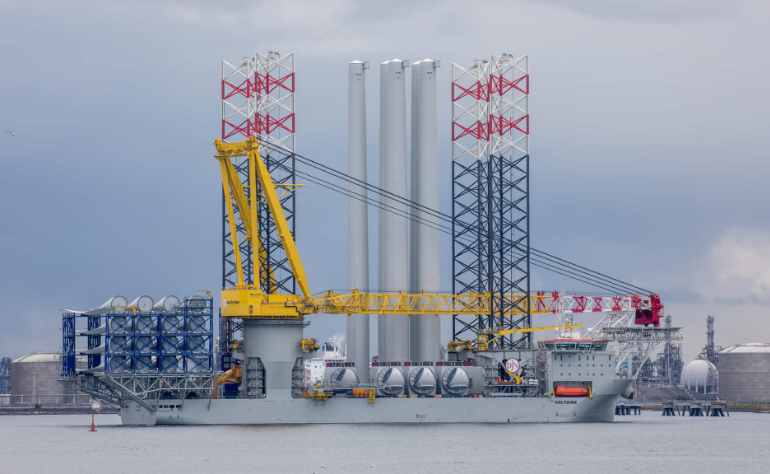 據(jù)悉,首臺海上風機于8月29日安裝完畢,第二臺風機于幾天前安裝到位。風機安裝作業(yè)由Jan De Nul旗下的“Voltaire”號自升式風電安裝船負責。