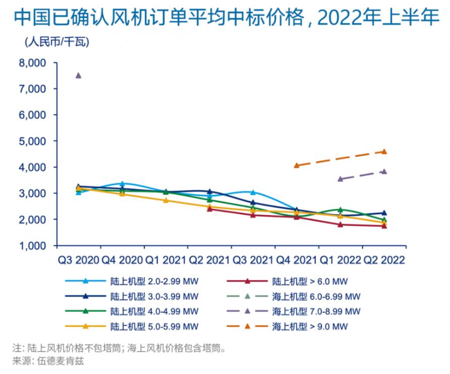 陸上風機平均中標價格在2022年第一季度再創(chuàng)新低。在首個7MW+陸上風電機組的批量訂單中,出現(xiàn)了歷史最低中標價格1408元/千瓦(不含塔筒)。雖然第二季度價格略有回升,但較2021年底水平仍下降了15%。新簽無補貼的海上項目與時間上最鄰近的有補貼的海上項目(2020年)相比,風機平均中標價格(含塔筒)下降了超過40%。大兆瓦機組的廣泛應用,使中國風電整機商能夠以較低的單位千瓦價格進行投標。例如,6MW陸上風機的平均價格比3MW陸上風機平均價格低22%。