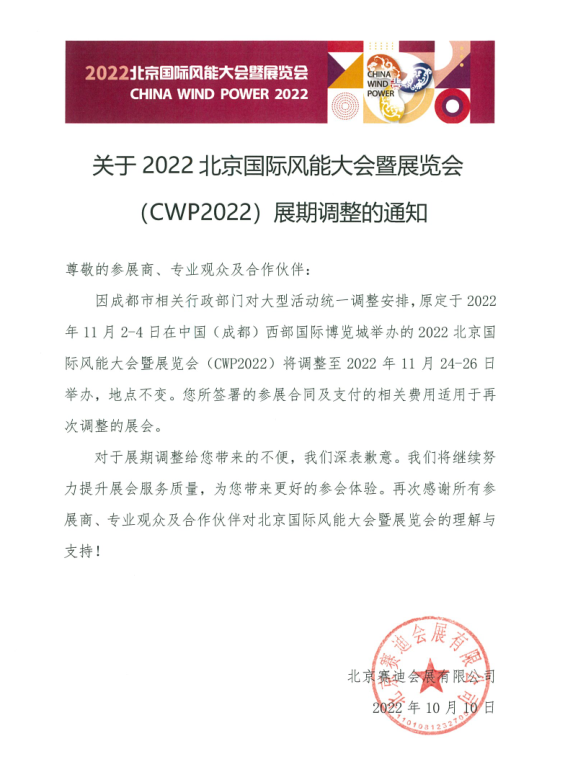根據(jù)成都市相關(guān)行政部門(mén)對(duì)大型活動(dòng)統(tǒng)一調(diào)整安排,原定于2022年11月2-4日在中國(guó)(成都)西部國(guó)際博覽城舉辦的2022北京國(guó)際風(fēng)能大會(huì)暨展覽會(huì)(CWP2022)將調(diào)整至2022年11月24-26日舉辦,地點(diǎn)不變。