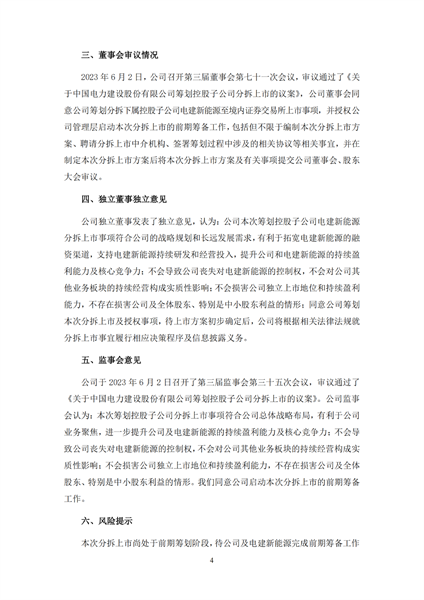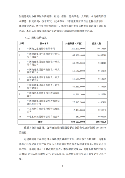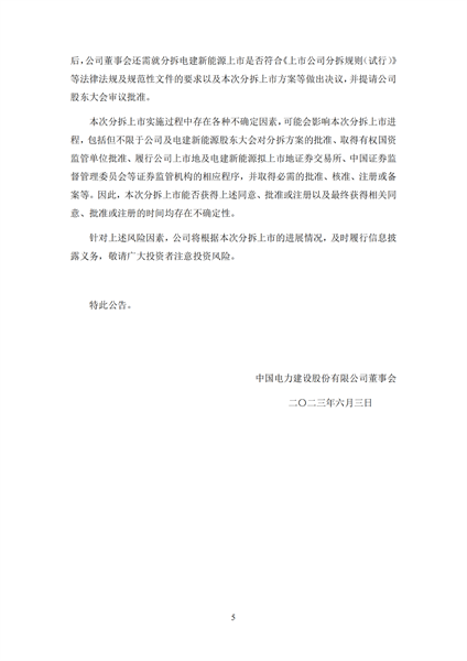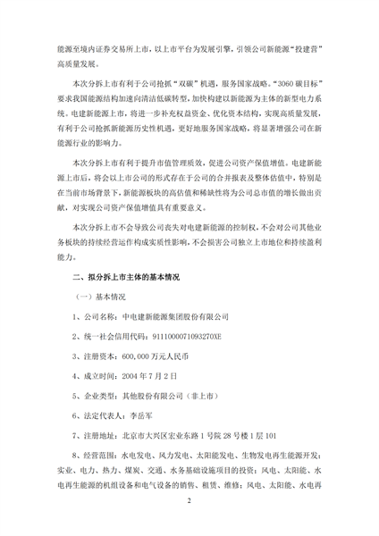 根據(jù)公告,擬拆分的中電建新能源集團(tuán)股份有限公司注冊資本為60億元,經(jīng)營范圍包括水電發(fā)電、風(fēng)力發(fā)電、太陽能發(fā)電、生物發(fā)電再生能源開發(fā)等。目前,電建新能源正在推進(jìn)引入戰(zhàn)略投資者相關(guān)工作。
