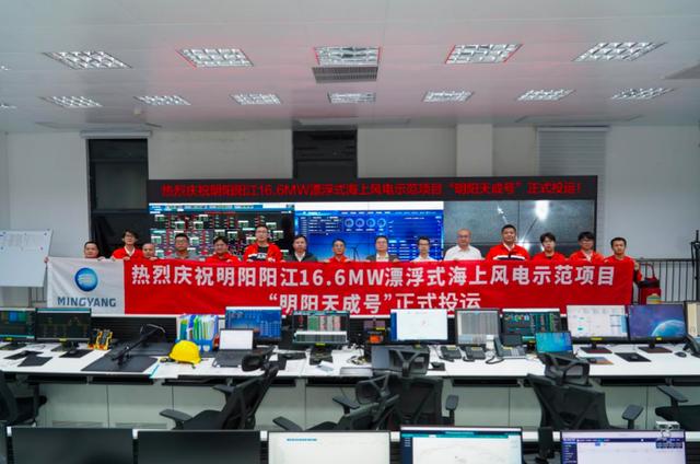 “明陽天成號(hào)”由明陽集團(tuán)自主研制,為全球首次在一個(gè)浮式基礎(chǔ)上搭載兩臺(tái)8.3兆瓦海上風(fēng)機(jī),總裝機(jī)容量達(dá)到16.6兆瓦,是目前全球最大的漂浮式風(fēng)電平臺(tái),平臺(tái)排水總量約1.5萬噸,投運(yùn)于離岸約70公里、水深約45米的明陽陽江青洲四海上風(fēng)電場(chǎng),預(yù)計(jì)每年可提供約5400萬度綠色電力,能滿足3萬戶三口之家一年的日常用電需求。