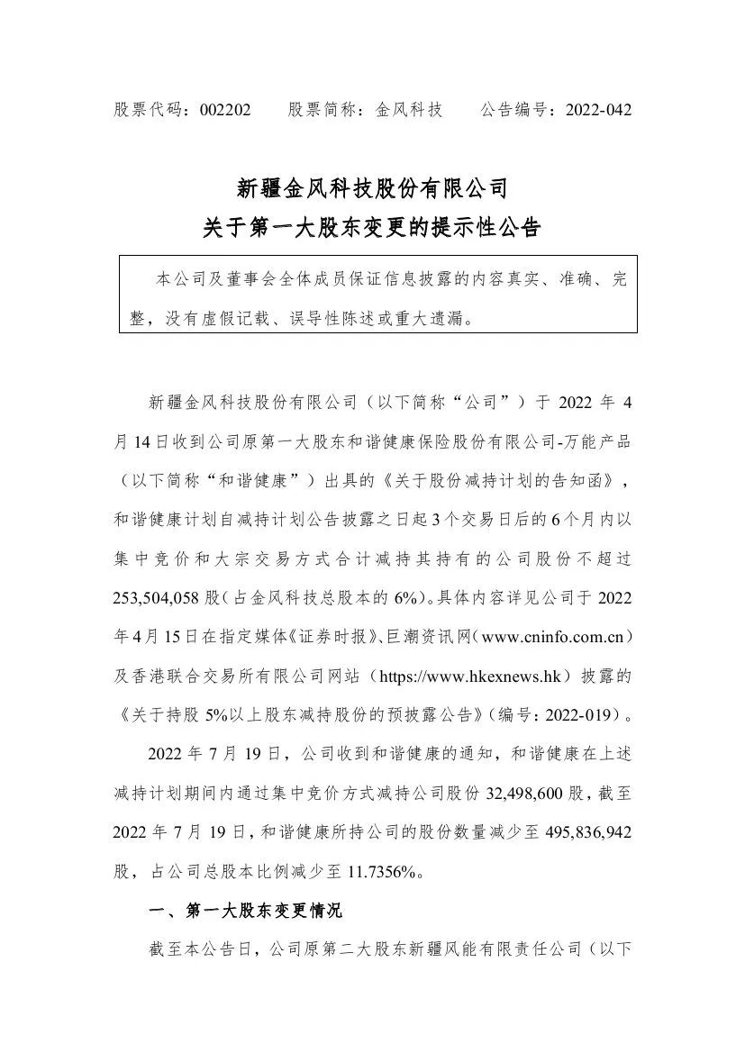 金風(fēng)科技日前發(fā)布《關(guān)于第一大股東變更的提示性公告》。截至2022年7月19日,公司原第一大股東和諧健康保險(xiǎn)股份有限公司-萬能產(chǎn)品(簡(jiǎn)稱“和諧健康”)所持公司的股份數(shù)量占總股本比例減少至11.7356%,原第二大股東新疆風(fēng)能有限責(zé)任公司(簡(jiǎn)稱“風(fēng)能公司”)被動(dòng)成為公司的第一大股東。