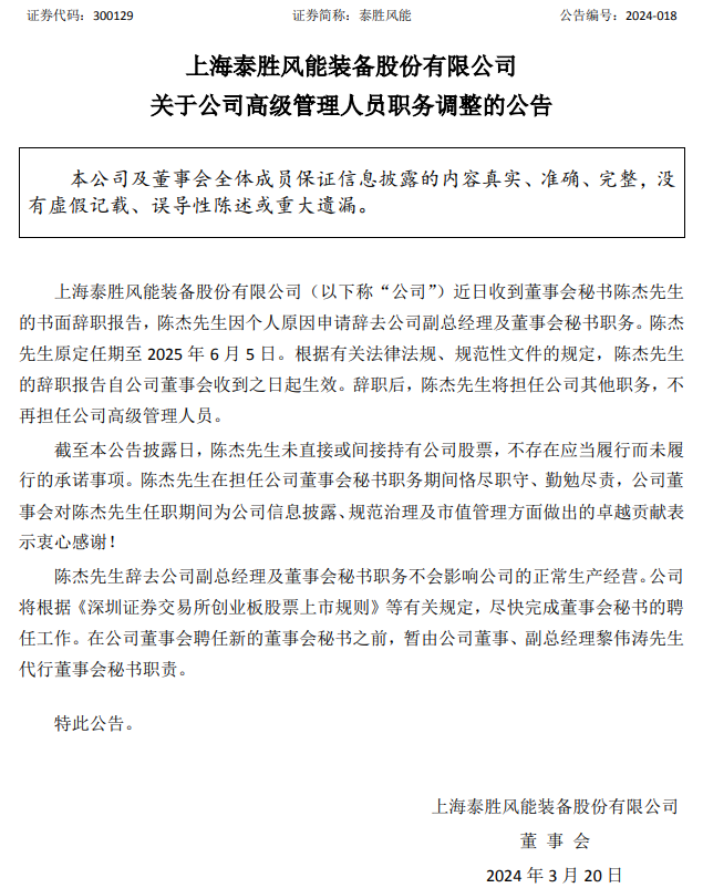 3月20日,上海泰勝風能裝備股份有限公司(簡稱:泰勝風能)發(fā)布關于公司高級管理人員職務調(diào)整的公告。