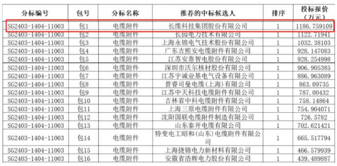 電纜附件一共16包,長纜科技中標(biāo)包1,報(bào)價(jià)為1186.759109萬元,中標(biāo)金額居16家中標(biāo)廠商中第一位置。
