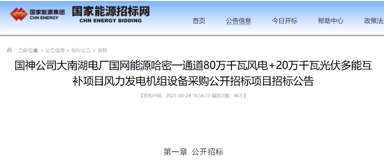 公告顯示,國(guó)網(wǎng)能源哈密一通道80萬(wàn)千瓦風(fēng)電+20萬(wàn)千瓦光伏多能互補(bǔ)項(xiàng)目場(chǎng)址位于新疆哈密大南湖地區(qū),工程場(chǎng)址中心距哈密市直線距離約96km,呈不規(guī)則多邊形,占地面積約165.05km²,風(fēng)電場(chǎng)擬安裝128臺(tái)6.25MW風(fēng)力發(fā)電機(jī)組,總裝機(jī)容量800MW,共分為兩個(gè)標(biāo)段:A標(biāo)段400MW,B標(biāo)段400MW。本項(xiàng)目計(jì)劃于2023年9月30日前開工(暫定);2024年6月30日前全容量并網(wǎng)發(fā)電。(暫定)