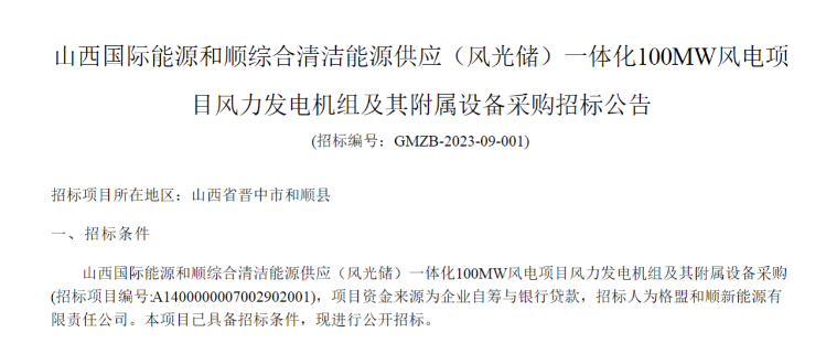 公告顯示,該項目位于山西省晉中市和順縣,總裝機容量為100MW,擬安裝16臺風電機組。