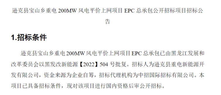 公告顯示,遜克縣寶山鄉(xiāng)重電200MW風電平價上網(wǎng)項目位于黑龍江省黑河市遜克縣寶山鄉(xiāng)境內(nèi),場址中心距遜克縣城直線距離約50km,規(guī)劃裝機總容量為200MW,一次性建設完成,風電場擬安裝32臺H193-6.25MW機型。