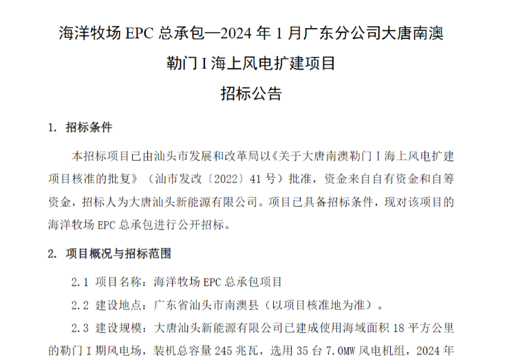 招標范圍:本次招標為大唐南澳勒門 I 海上風電擴建項目海洋牧場 EPC總承包工程,包括但不限于勘察設計、采購、運輸、施工、調試、驗收、質量保證服務(含 CCS 檢測認證、三同時)等全部工作及招標技術文件規(guī)定的其它工作,具體工作范圍詳見技術規(guī)范書。