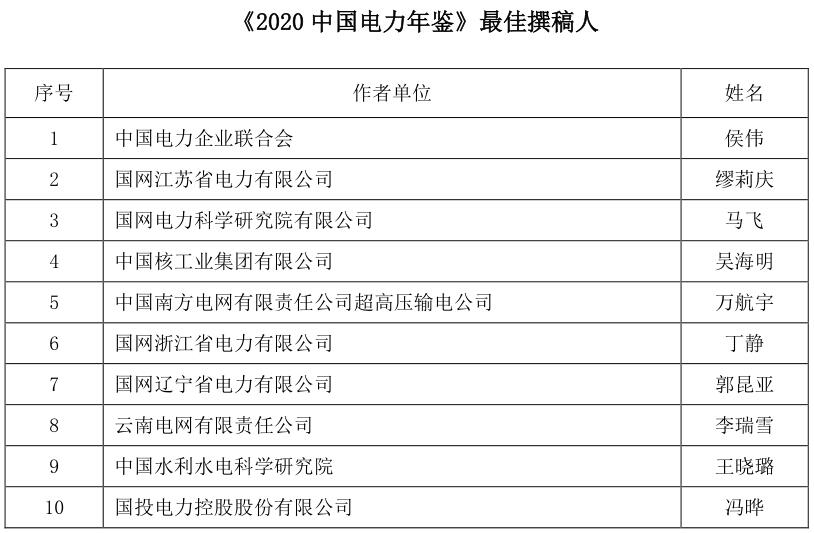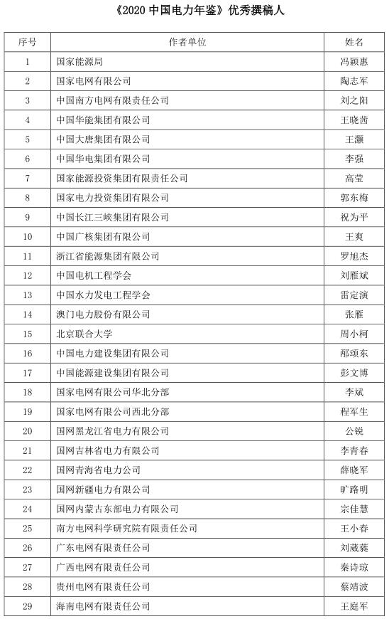 為促進(jìn)《年鑒》編撰質(zhì)量的進(jìn)一步提升,表彰在年鑒編撰工作中表現(xiàn)突出的先進(jìn)個(gè)人,根據(jù)《<中國(guó)電力年鑒>優(yōu)秀撰稿人評(píng)獎(jiǎng)辦法(試行)》,經(jīng)年鑒編輯部初評(píng)、評(píng)選委員會(huì)審核,評(píng)選出《2020中國(guó)電力年鑒》最佳撰稿人和優(yōu)秀撰稿人,現(xiàn)將名單予以公示。