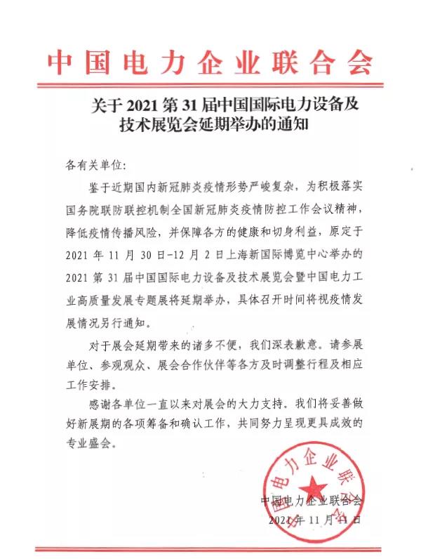 鑒于近期疫情防控形勢(shì)趨于嚴(yán)峻,為了貫徹落實(shí)國(guó)務(wù)院聯(lián)防聯(lián)控機(jī)制防疫要求,以所有參展商與觀眾的健康安全為首要考慮,同時(shí)保障展會(huì)效果,原定于 2021年11月30日至12月2日在上海新國(guó)際博覽中心舉辦的「第三十一屆上海國(guó)際電力設(shè)備及技術(shù)展覽會(huì)」暨「第二十三屆上海國(guó)際電工裝備展覽會(huì)」延期舉辦。具體延期方案將根據(jù)政府疫情防控規(guī)定另行通知。