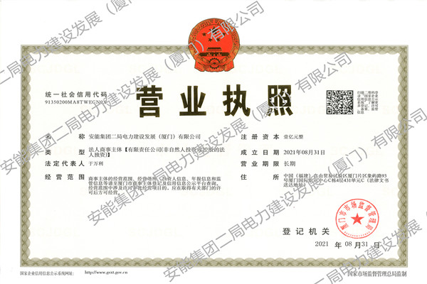中國電力網(wǎng)訊 8月31日,中國安能第二工程局電力建設發(fā)展(廈門)有限公司順利完成工商登記并取得營業(yè)執(zhí)照。