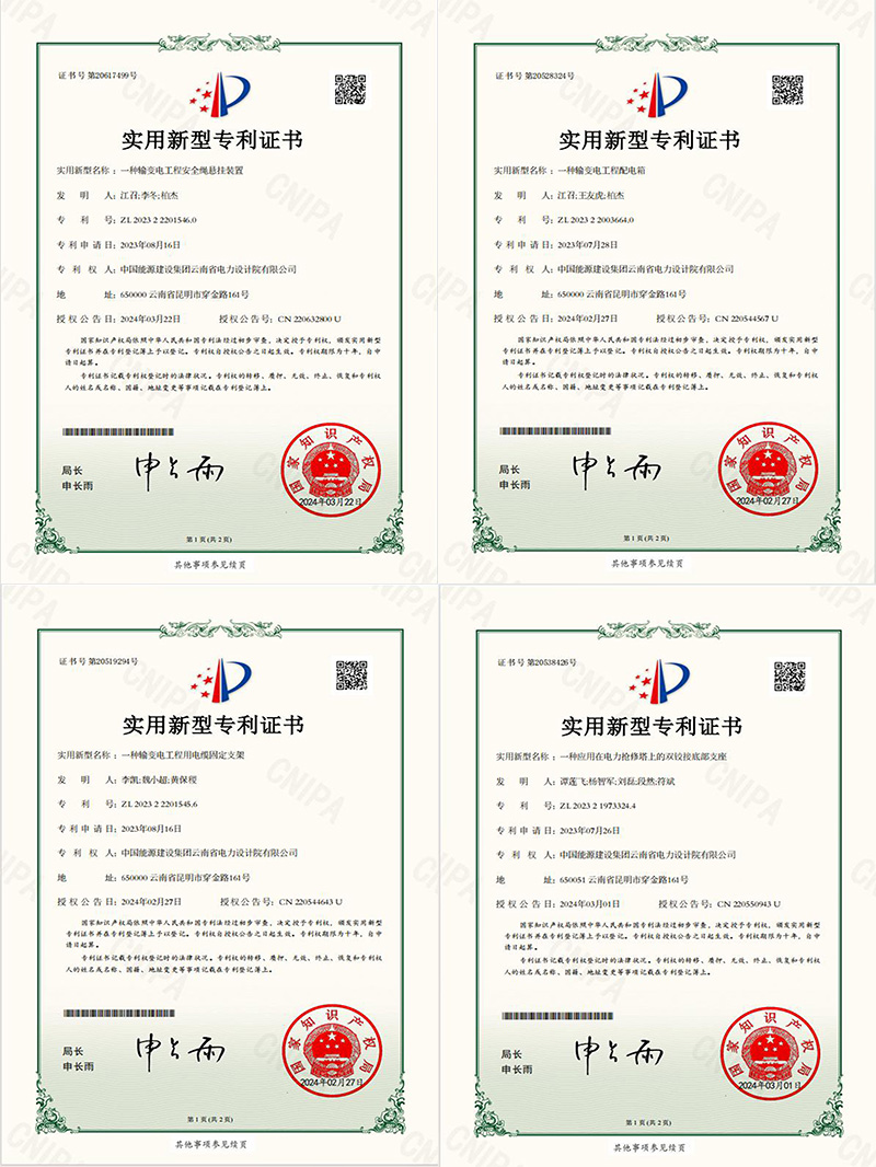 近日,由中國能建中電工程云南院獨立研發(fā)的“一種輸變電工程配電箱”“一種應(yīng)用在電力搶修塔上的雙鉸接底部支座”“一種輸變電工程用電纜固定支架”“一種輸變電工程安全繩懸掛裝置”四項成果獲得國家實用新型專利。